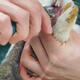 獣医さんでみてもらうと、案の定、上の歯が伸びすぎていて先が割れてしまっていること、下の歯も伸びてしまい、口の中のどこかに当たってしまっているのでは、という診断を頂きました。獣医さんは、ヤンちゃん仰向けになるように抱えて、ペンチのような道具で歯を切って下さいました。