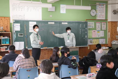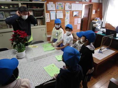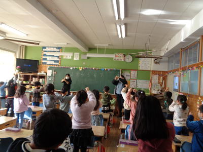 12月20日(月)、児童が進学する予定の玉川中学校の英語科の教員とALTにご来校いただき、6年生に外国語の出前授業を行っていただきました。内容は、クラスルームイングリッシュ(授業中に教員や児童が使う英語)やアルファベットの文字についてです。ゲームなどがおり混ぜられ、中学校に向けた授業が楽しく展開されました。